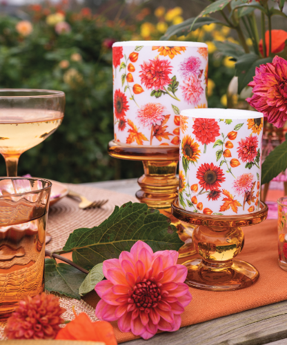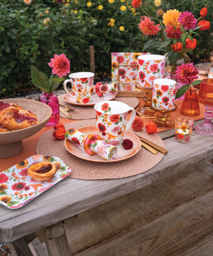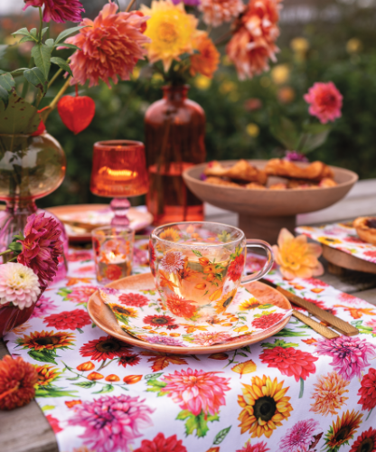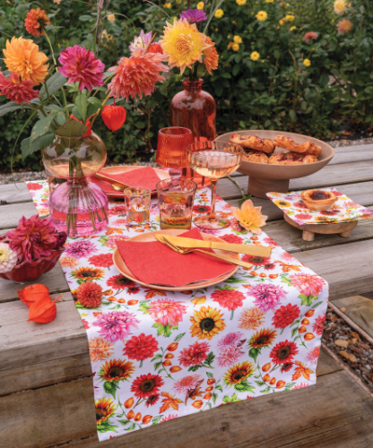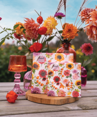 The Autumn blooming collection is a celebration of nature’s final burst of colour before winter. The design features richly illustrated autumn flowers in bold tones of orange, red and pink, set against a soft backdrop that allows each bloom to shine. The overall composition has the feel of a blooming bouquet – ideal for creating warm, inviting settings both in-store and at home.