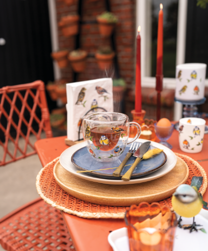 The “Bird species” series is not only available on a lunch napkin, this colorful composition of garden birds also looks great on cocktail napkins and handkerchiefs. Bring some natural beauty into your customers' homes with our small and large mugs or the double-walled tea glass. Have a delicious drink and enjoy the birds, but without binoculars, just in the house. Add a cozy candle and a bowl with some nuts and your customers and the birds will be happy.