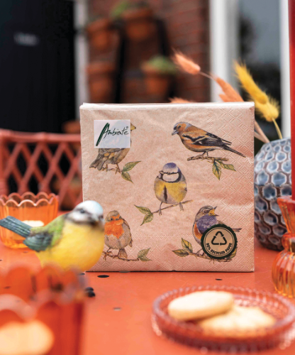 The “Bird species” napkin design is another colorful addition to our 'Everyday' collection. A white napkin with 5 different, common garden birds in all the splendor of their plumage. A unique hand-drawn napkin with an accompanying range of accessories to add some color to your customers' homes. Do you take the birds to a good home?