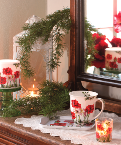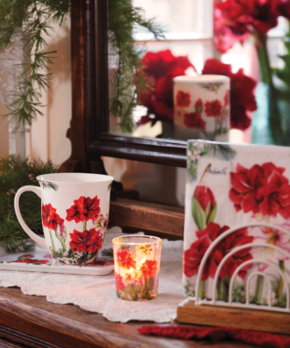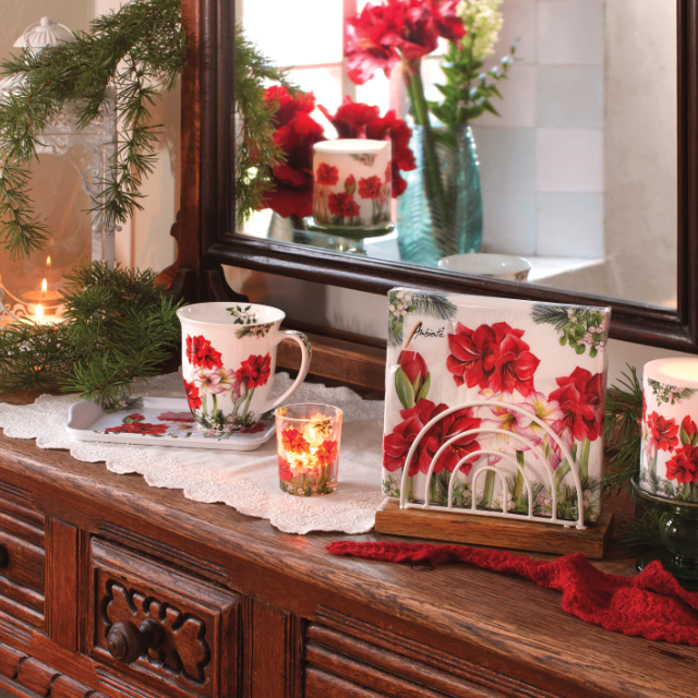 The Blooming amaryllis collection offers your customers a refined way to celebrate the season. At its heart is the majestic red amaryllis, a flower symbolising pride and beauty, rendered in rich seasonal tones. Accented with green foliage and subtle festive details, this design adds a sophisticated yet cosy feeling to winter tables.