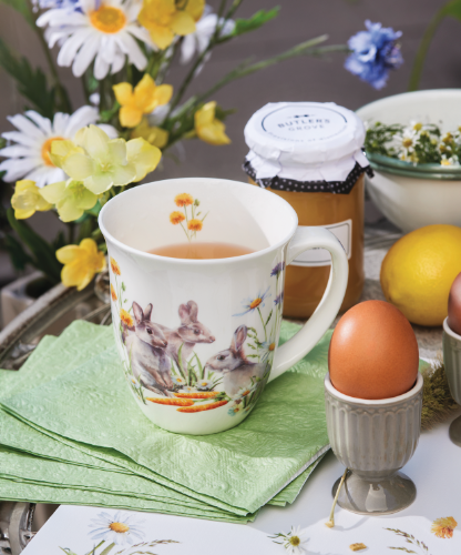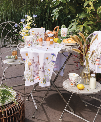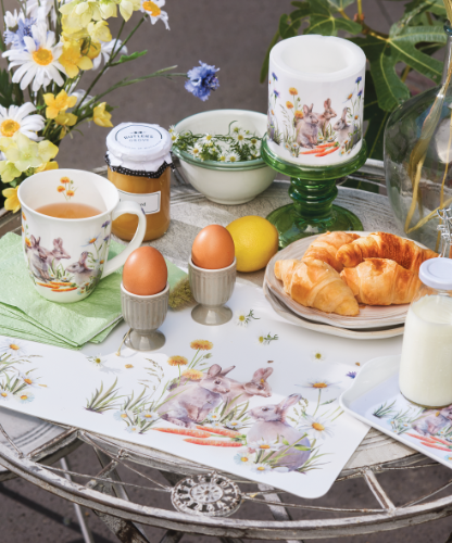 Especially for you and your customers, we have added a sweet and cheerful Easter design for our napkins to our spring collection. Inspired by the magic of the season and the adorable charm of rabbits, carrots and spring flowers, we thought this design was ideal for an extensive series. And rightly so, the accessories create exactly the atmosphere we had in mind. Atmospheric, sweet and cozy, suitable for Easter, spring and a favorite of many children. What more could you want?