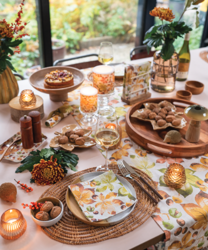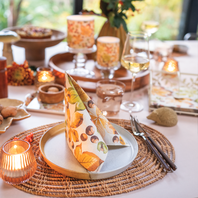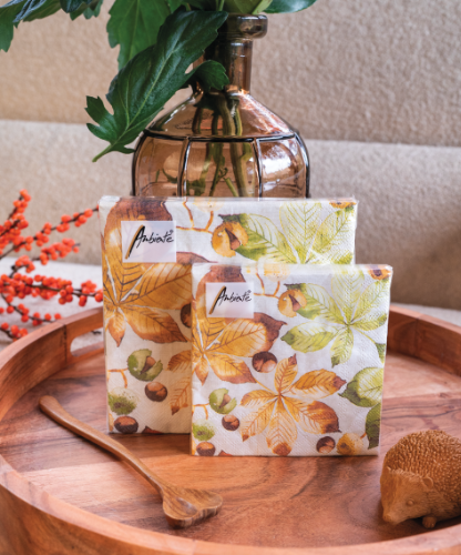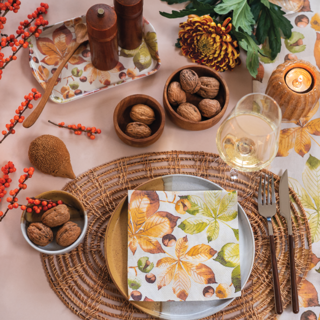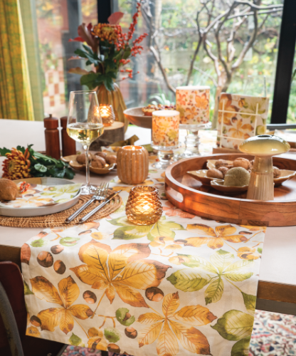 The Castanea series is a tribute to the understated beauty of autumn. Featuring softly illustrated chestnut leaves in warm neutrals and muted greens, this design brings a grounded, natural feel to seasonal settings. It’s a calm and gentle alternative to the often bold and bright colours of autumn, ideal for interior styles that favour softness and simplicity.