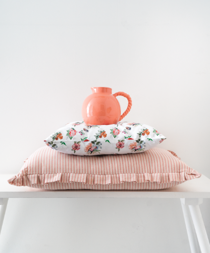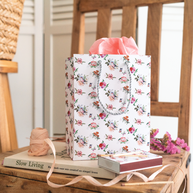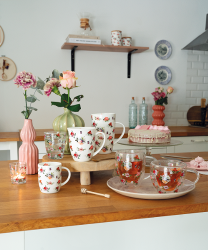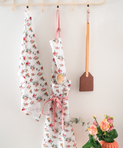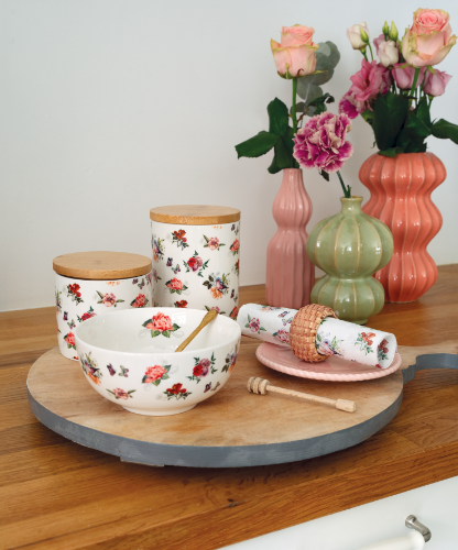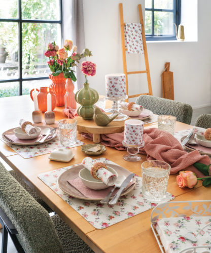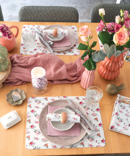 The "Charlotte" napkin series exudes romance and summer elegance. The design, featuring pink and red roses, subtle butterflies, and a cute little bird against a white background, creates a stunning all-over effect that complements a variety of interior styles, from rustic to modern and vintage. Its versatility makes it easy to create a charming breakfast table, a delightful picnic setting, or a romantically set dinner table.