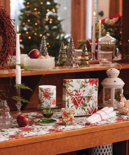 Holly with red berries, poinsettias, pine sprigs—they're part of a fresh and typically wintry composition that brings the Christmas spirit right around the corner. "Christmas florals" is a cheerful and colourful napkin design where, apart from the accompanying products in this series, little else is needed to instantly create the right atmosphere. Whether in your store or on your customers' dining tables, this series is a true must-have.