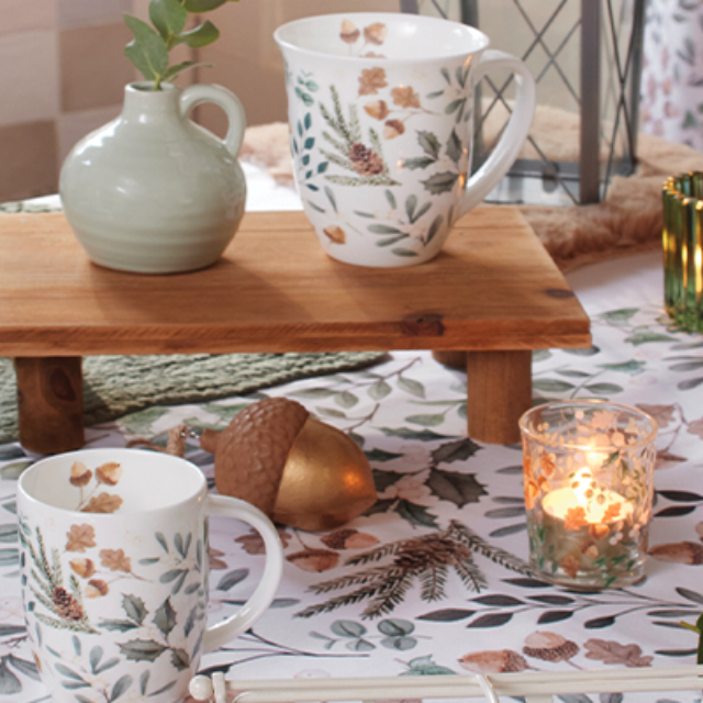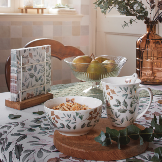 The Collection of leaves series brings the earthy stillness of autumn into focus. Delicately painted leaves and small acorns in muted green, beige and taupe tones create a calming visual that reflects the natural changes of the season. This design brings softness and simplicity to any table setting, display or gift assortment.