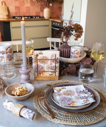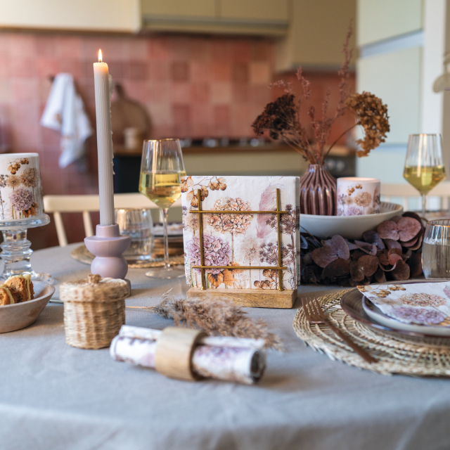 Visually stunning, timeless, and effortlessly versatile; our new napkin series "Dried flowers" is a true asset. The warm tones and dried blooms add a natural charm to any occasion. This paper napkin, with its soft pastel colours, is a warm design suitable for year-round everyday use.