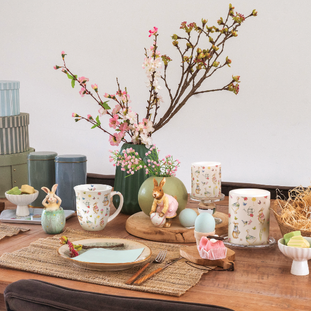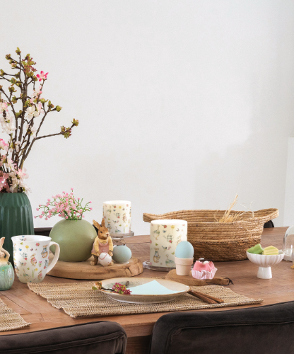 The “Easter garden” napkins are available in both lunch and cocktail sizes, making them the perfect foundation for a stylish brunch, lunch, or dinner. To enhance the charm of the Easter table, we’ve created a subtle, complementary collection. For extra cosiness and light, we’ve added candles and matchboxes, as well as large and small mugs for warm drinks, an adorable bowl, a small tray, placemats, and a lovely tea towel. This will bring a season full of nostalgia and atmosphere for both you and your customers.