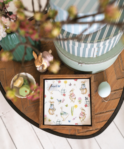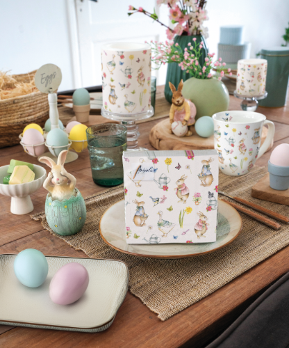Bring the magic of spring to life on your customers’ dining tables with the adorable, nostalgic “Easter garden” napkin series. This vintage-style design evokes the beloved characters of childhood books, featuring a rabbit in a blue jacket. Similarly, the “Easter garden” napkin transports you to an idyllic Easter garden filled with cute animals. The three main characters—a goose and two charming bunnies in pastel colours—are the stars of the show. One bunny, dressed in a pink jacket, holds a bouquet of daffodils, while the other, wearing a blue jacket with a bowtie, carries a basket of flowers. A goose in a blue cape, butterflies, blossom branches, a blue tit, and a watering can complete the playful scene. The soft colours and loving details in this design create a cheerful, nostalgic atmosphere for any Easter table.