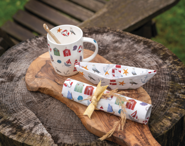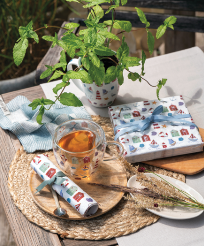 Bring the coastal charm of beach and sea directly to your customers' tables with our latest summer napkin series, "Nautical items." Featuring an all-over print of iconic maritime symbols such as beach huts, seashells, boats, lighthouses, seagulls, anchors, starfish, and lifebuoys, this lively and colourful design instantly evokes the spirit of holidays, swimming, and boating adventures. Using classic maritime colours like blue, red, and white, these napkins will transport your customers to harbours and beaches, even as they enjoy a strong cup of coffee or a large steaming mug of tea in their own home or garden.