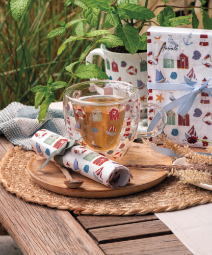 Both subtle and practical, the "Nautical items" series offers a wide range of products that will look great in your shop, instantly evoking that perfect holiday feeling for your customers. Naturally, the collection includes paper napkins in both lunch and cocktail sizes, candles in two sizes, tea towels, a small serving tray, double-walled tea glasses with a 0.25-litre capacity, and mugs in 0.2 and 0.4-litre sizes.