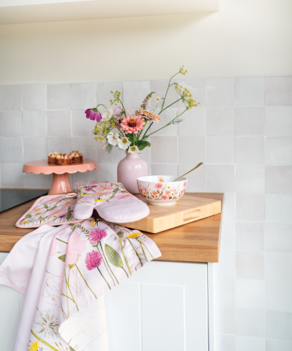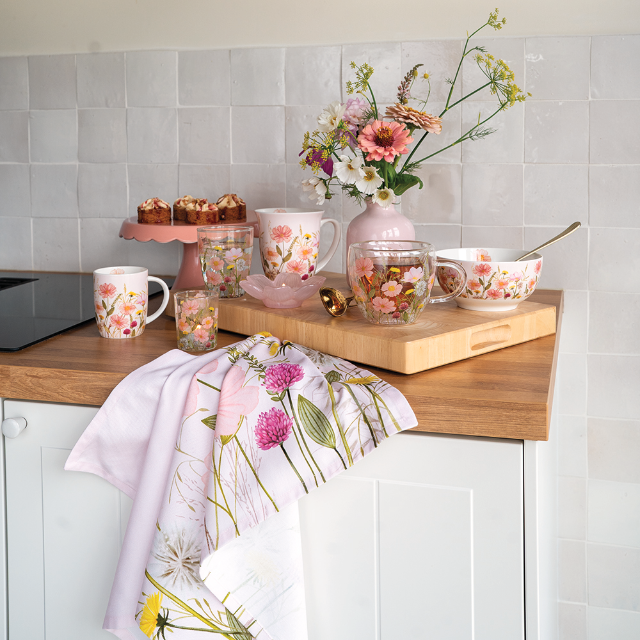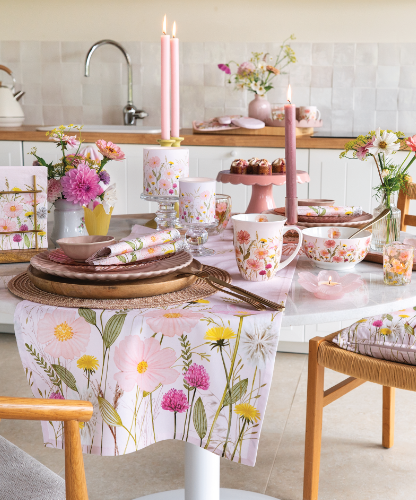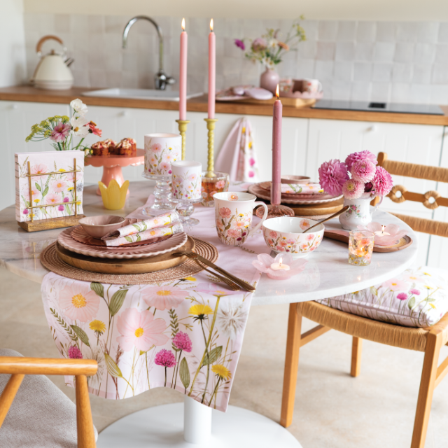 Pastel flowers offers a wide selection of accessories, from napkins in multiple sizes to mugs, glasses, candles, placemats, bowls and kitchen textiles. A highlight is the new tablecloth, an elegant addition that instantly completes the entire table setting. Combined with napkins and runners, it creates a harmonious look that allows retailers to present their customers with a full and inspiring dining experience.
