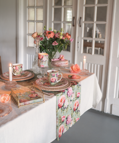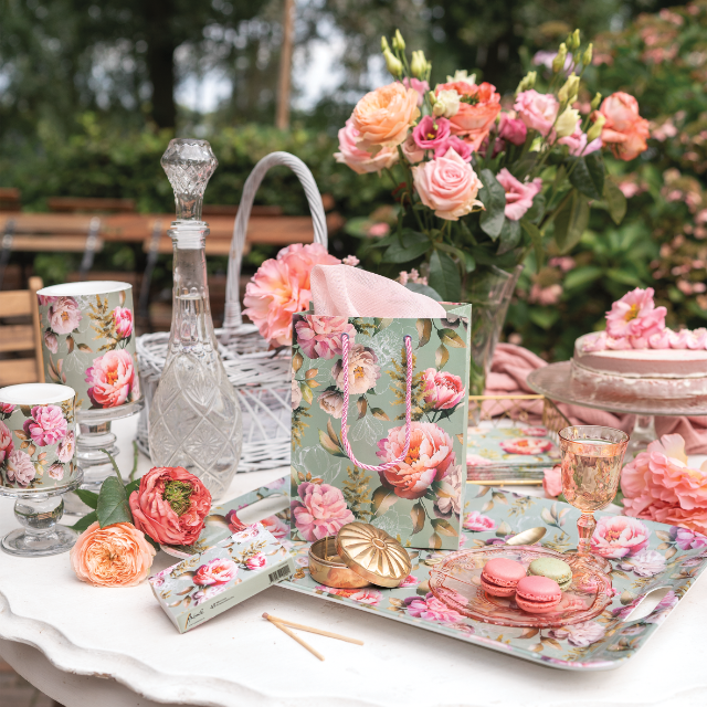 The romantic world of full, soft, pink peonies. You will find this on our new napkin design “Peonies composition”. A symphony of romance and summer splendor, captured in a hand-painted design. The napkin is available in 3 color variants; cream, black and green. With the green variant we have a full range of the most diverse accessories to offer your customers a touch of romance in the kitchens, dining and living rooms.