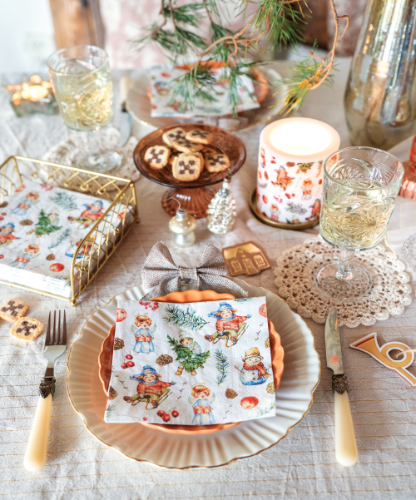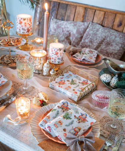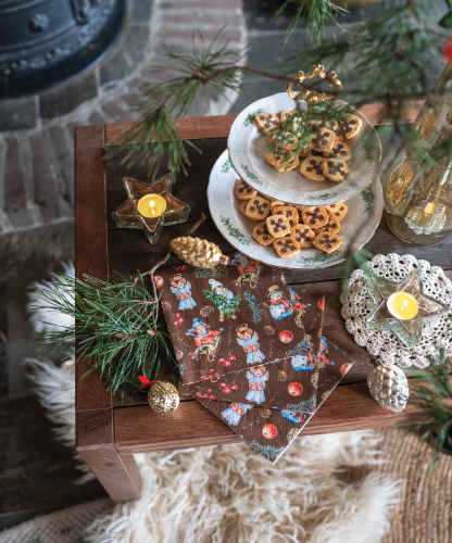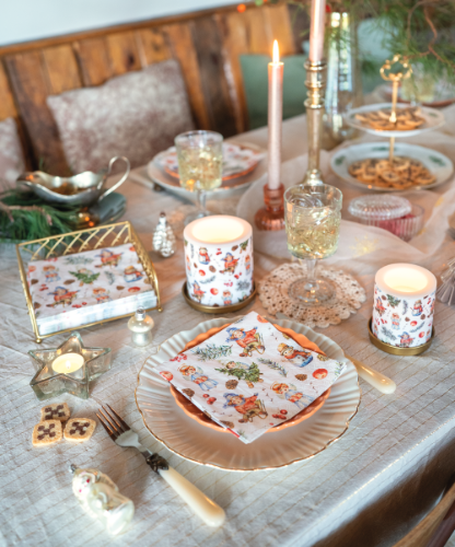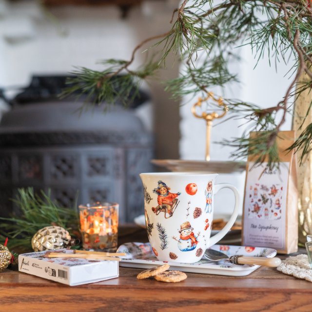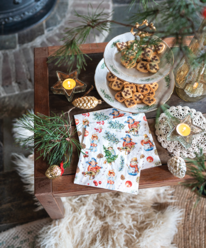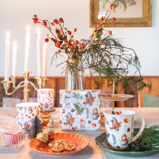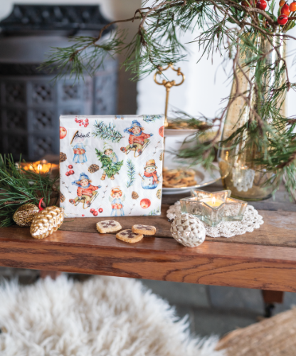 The Playing outside collection captures the joy of wintertime through beautifully illustrated scenes of snowy fun. Children on sleds, carrying a Christmas tree, building snowmen or playing in the garden are all part of this soft and nostalgic design, surrounded by fir branches, pinecones, berries and bright red apples. A peaceful all-over print that invites your customers to remember and recreate the warmth of winters past.