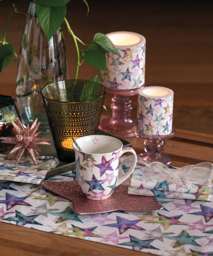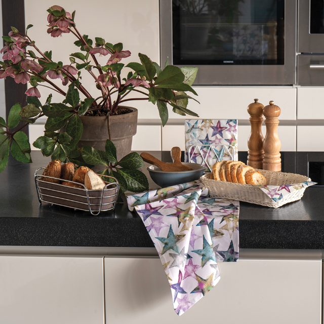The "Watercolour stars" series offers an extensive collection, from paper lunch and cocktail napkins to two different candle sizes, a large mug, tea towel, table runner, placemat, and small tray. Create a modern kitchen with a festive breakfast and these fresh napkins, perfectly complementing contemporary decor.