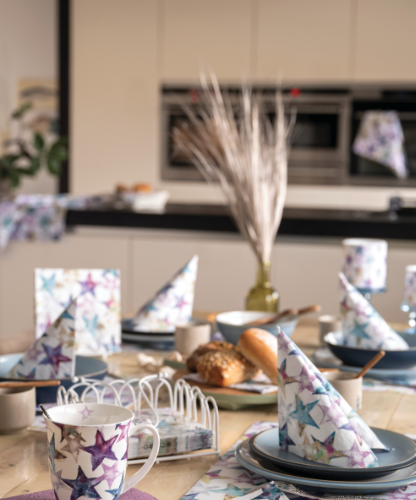 Under a sky adorned with sparkling watercolour stars, our new napkin series, "Watercolour stars," brings a modern and playful elegance to every table. Let the fresh purple tones harmonize with aqua blue, light pink, or white, transforming ordinary moments into extraordinary occasions.