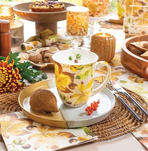 Of u nu een knus theemoment wilt creëren voor uw klanten of een elegante herfsttafel wilt dekken in uw winkel ter inspiratie, de "Castanea" serie biedt stijlvolle mogelijkheden. De servetten in cocktail- en lunchformaat worden prachtig aangevuld met een bijpassende mok, kleine en grote kaars, dienblad, tafelloper en theedoek. Dankzij de neutrale en natuurlijke uitstraling past dit design perfect bij houten accenten, linnen tafelkleden en warme wollen plaids.