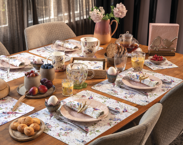 De veelzijdigheid van Busy birds maakt het eenvoudig om te combineren. Voor een frisse en natuurlijke look werkt het dessin prachtig samen met licht servies en houten details. Voor een zachtere, romantische stijl combineert u de accessoires met pastelservies of subtiel glaswerk. Ook op een feestelijk gedekte tafel met bloemen en kaarsen komen de speelse vogels prachtig tot hun recht, zoals de foto’s uit onze shoot perfect laten zien.