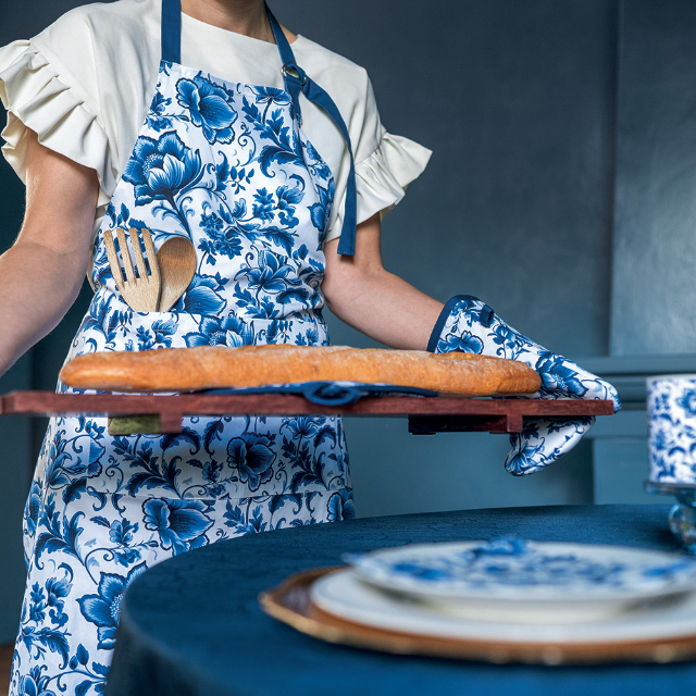Naast servetten in diverse maten omvat Delft blue florals een breed assortiment accessoires. Denk aan mokken, kaarsen, glazen, placemats, dienbladen en kussens. Ook textiel zoals schorten, keukenhanddoeken en tafellopers zijn uitgevoerd in dit dessin. Samen met het broodmandje en pannenlap vormt de serie een complete collectie waarmee uw klanten een uniform en aantrekkelijk tafelaanbod kunnen presenteren.