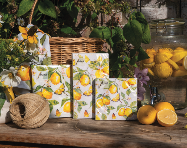 De veelzijdigheid van Fresh lemons maakt het mogelijk om de serie in uiteenlopende settings te gebruiken. Voor een rustige uitstraling combineert u de servetten met wit servies en natuurlijke materialen zoals hout of linnen. Wilt u juist meer kleur en levendigheid? Mix de citroengele accenten met felblauwe accessoires voor een uitgesproken mediterrane look. Ook bij buitenmomenten, zoals een picknick of barbecue, zorgt deze serie voor een stijlvol en samenhangend geheel.