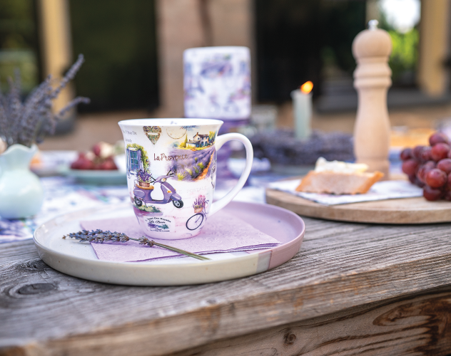 Combineer La Provence met neutrale tinten zoals wit, grijs of naturel hout voor een rustige basis. Voeg groene of paarse accenten toe met bloemen of tafeldecoratie om het lavendeldessin extra te laten spreken. Serveer Franse lekkernijen zoals kaas, brood en wijn om de Provence-beleving compleet te maken. Zo creëert u een tafelmoment dat voelt als een mini-vakantie.