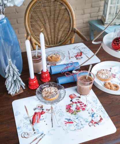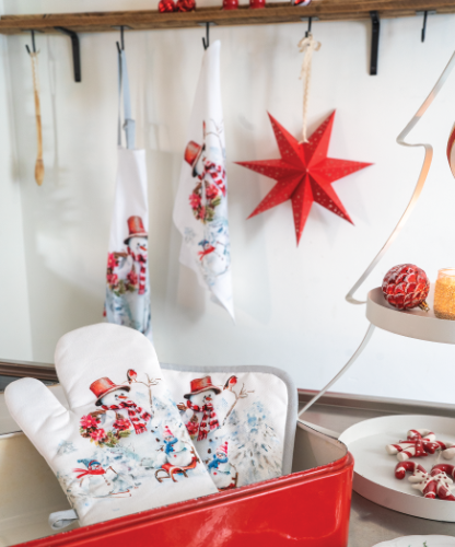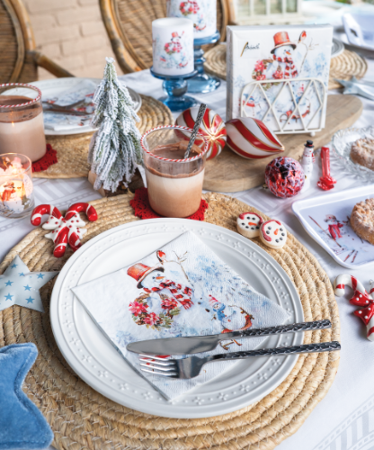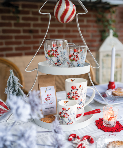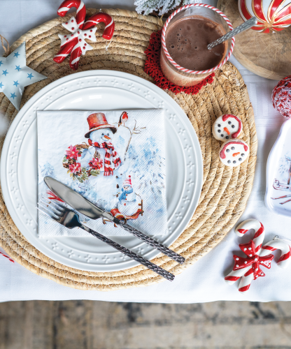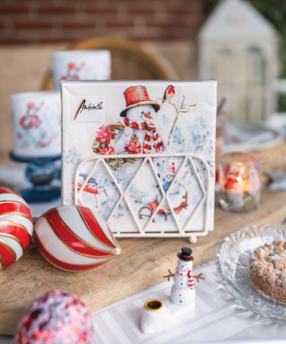 Binnenkomen of zelfs thuiskomen in een wereld vol speelse sneeuwpret met de nieuwe serie “Sporty snowmen”. Deze vrolijke en winterse serie brengt het ultieme seizoensgevoel naar uw winkel en de tafels en interieurs van uw klanten. Charmante sneeuwmannen trekken eropuit in een wit, glinsterend landschap vol besneeuwde bomen: op ski’s, met een slee en wandelend met een krans in de hand. Details zoals rode sjaals, kleurrijke mutsen en een nieuwsgierig roodborstje maken dit ontwerp levendig, gezellig en onweerstaanbaar.